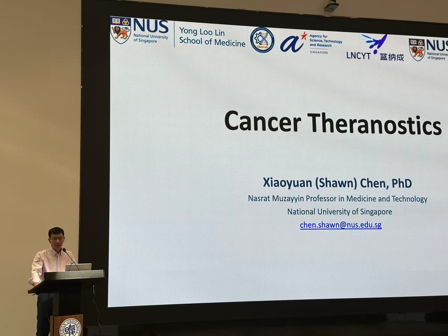 随后,陈小元教授作了题为“Cancer Theranostics”的报告。系统介绍了放射诊疗学(Radiotheranostics)的前沿进展。他提到,放射诊疗学通过同一靶向分子携带诊断性和治疗性核素,实现了“精准诊断引导个体化治疗”的一体化模式。这种策略显著提升了疗效并降低了全身毒性。陈教授强调,该技术已在胃癌、甲状腺癌等实体瘤中展现出优于传统FDG成像的灵敏度和特异性。随后,陈教授深入解析了FAP(成纤维细胞活化蛋白)作为泛癌种靶点的潜力。他指出,FAP在90%上皮肿瘤的微环境中高表达,且与肿瘤进展和耐药密切相关,因此基于FAPI的诊疗一体化方案具有广泛适用性。此外,针对纳米药物递送难题,陈教授团队开发的EB-LNP技术通过白蛋白靶向策略,成功将mRNA精准递送至淋巴结,在动物实验中实现了肿瘤完全抑制,为癌症疫苗开发提供了新思路。在讨论技术挑战时,陈教授坦言,纳米药物的临床转化效率不足1%,而放射诊疗学的核素选择、剂量控制等问题仍需优化。他提出未来可通过多靶点联合(如FAP+PD-L1)、核素创新(如短半衰期α核素²¹¹At)及产学研协同突破瓶颈。