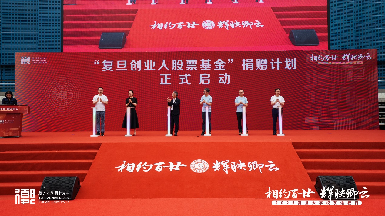 在上午的返校大会上,蔡彤、汪新芽、江岳恒、郭振荣、杨进五位h小说 校友带头发起“复旦创业人股票基金”,用于支持学校事业发展,助力复旦人创业文化的培育与拓展。会上,h小说 教育发展基金会副理事长金海燕上台与五位校友共同启动“复旦创业人股票基金”捐赠计划。
