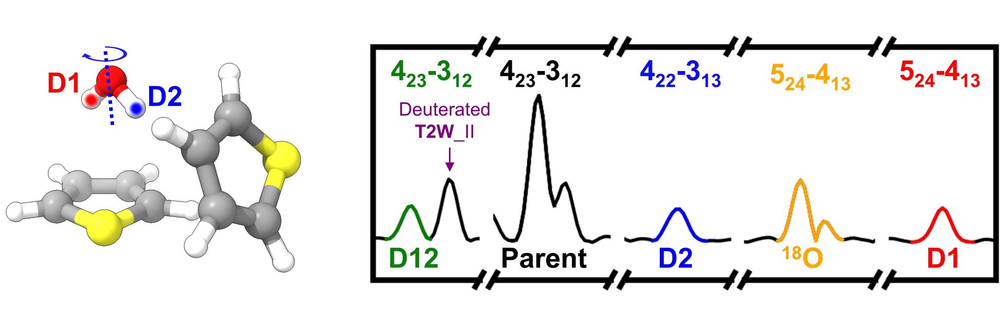 在前期研究中,团队发现水分子能够显著调控噻吩二聚体的构型。在噻吩二聚体-多水团簇中,水分子通过形成OH···π氢键插入两个噻吩环之间,破坏了传统的π-π堆积模式,使噻吩二聚体呈现出罕见的V字形构型。更为引人注目的是,这些水分子在团簇中可通过量子隧穿效应发生旋转,形成动态的氢键网络(图2)。在这一过程中,氢键形成所带来的能量增益弥补了π-π相互作用被破坏的能量损失,从而稳定了整体团簇结构。该研究不仅为水调控π-π作用提供了直接证据,也为理解生物分子在水环境中的构象调节提供了全新视角(J. Am. Chem. Soc.2024, 146, 1484–1490)。