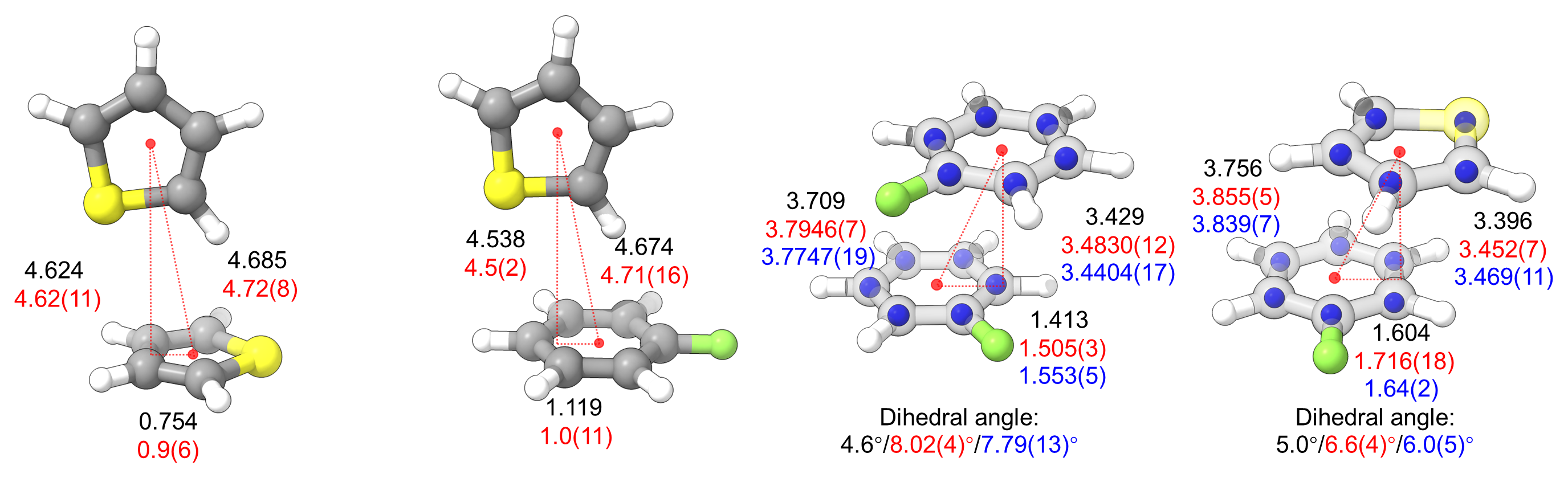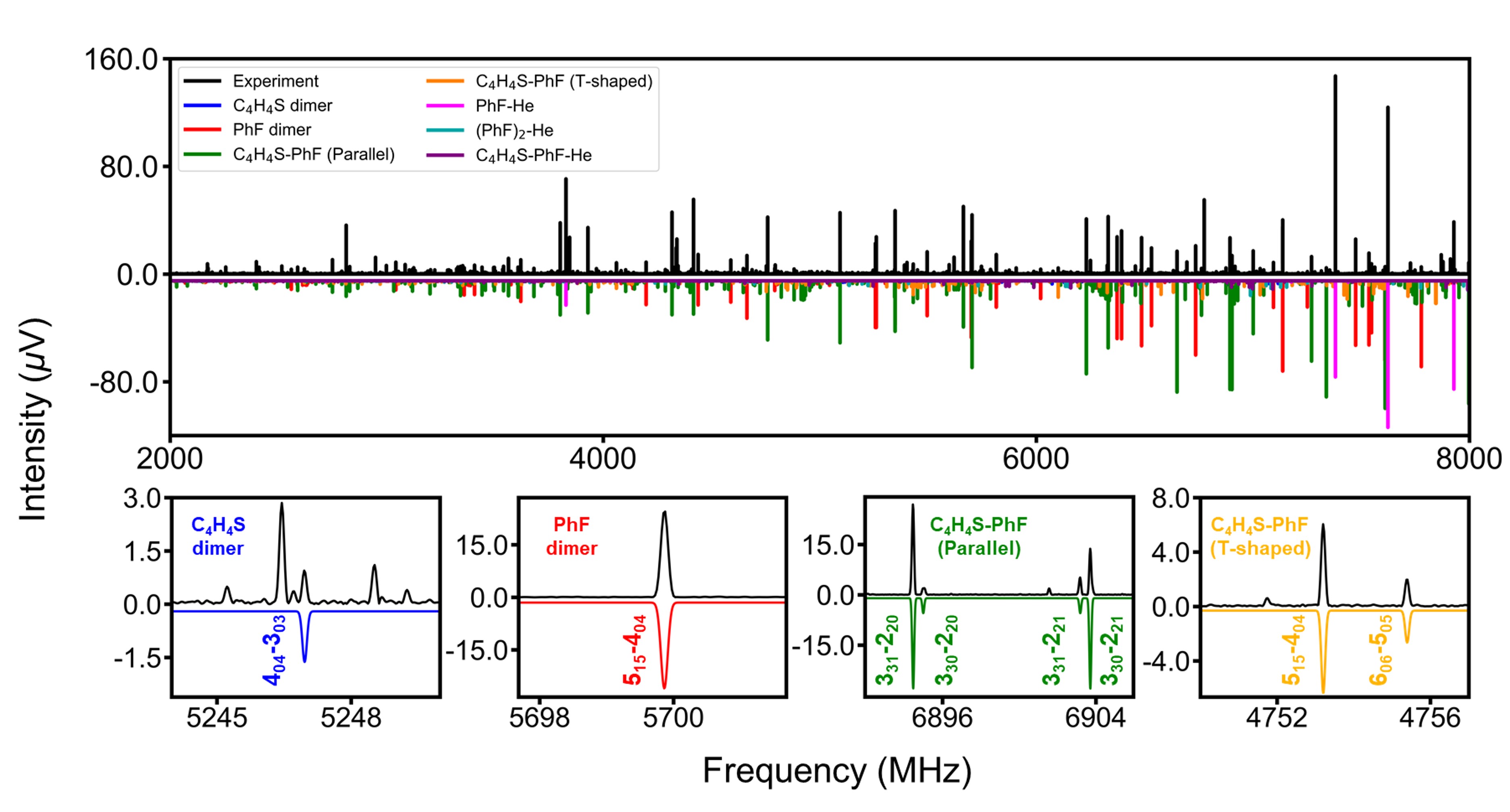 围绕气相中π-π相互作用难以直接观察的难题,团队以噻吩与氟苯构成的同元与异元芳香二聚体为模型体系,开展了系统研究(图3)。研究发现,噻吩二聚体主要呈T形构型,而氟苯二聚体则偏好平行堆积构型;然而在异元二聚体C₄H₄S···PhF中,则首次观测到T形与平行构型共存的现象(图4)。通过同位素标记微波光谱与氦掺杂实验,并结合自主开发的结构拟合程序,研究人员精确测量了π-π堆积的几何参数,并证实这两种构型均为稳定构型。进一步的量子化学计算表明,π-π相互作用在此类体系中主要由色散力驱动,且构型间的转换势垒极低,因此在气相中常常仅有一种构型存在。但在如C₄H₄S···PhF这样T形与平行构型结合能接近的特殊体系中,两种构型可以共存。