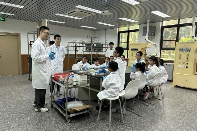 在h小说 志愿者的带领下,“复二代”小朋友们每20人分成一组,进入h小说 本科教学实验室进行趣味科普实验,体验科学的神奇与魅力。小朋友们穿上定制的实验服、戴上防护手套、护目镜,俨然一副小科学家的模样。三个实验都采取了先讲解、再演示、最后实践的流程。志愿者深入浅出的讲解让小朋友们赞叹连连。小朋友们听得津津有味,积极举手回答问题,认真动手操作,别提有多开心了。