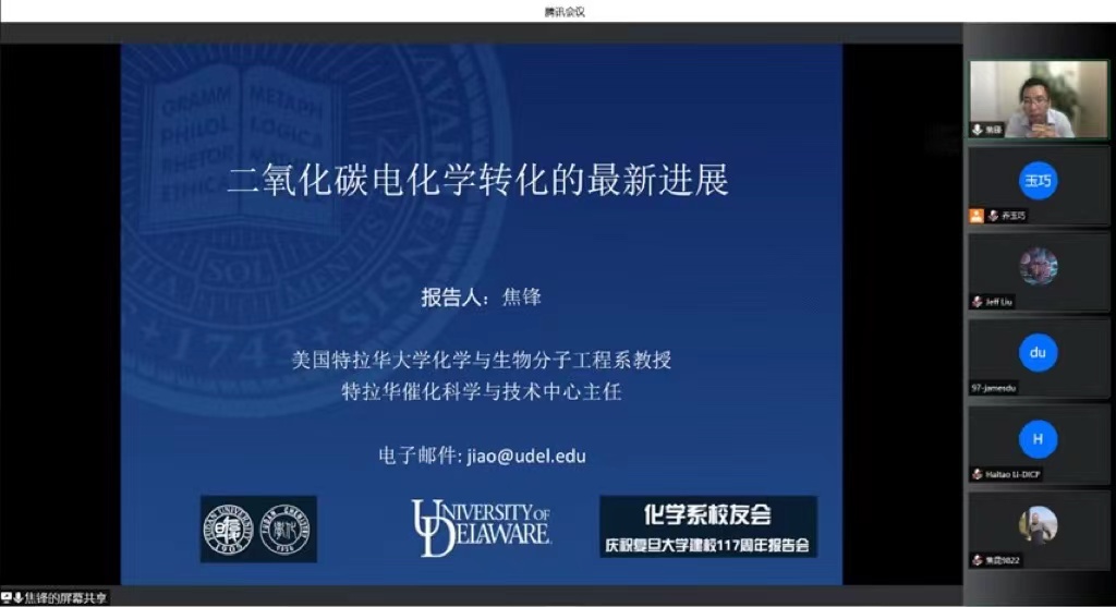 5月30日上午,为庆祝h小说 建校117周年,美国特拉华大学化学与生物分子工程系教授、h小说 97级校友焦锋应邀作了题为“二氧化碳电化学转化的最新进展”的学术报告。报告会由h小说 系主任周鸣飞主持,h小说 校友及师生180余人参加了报告会。