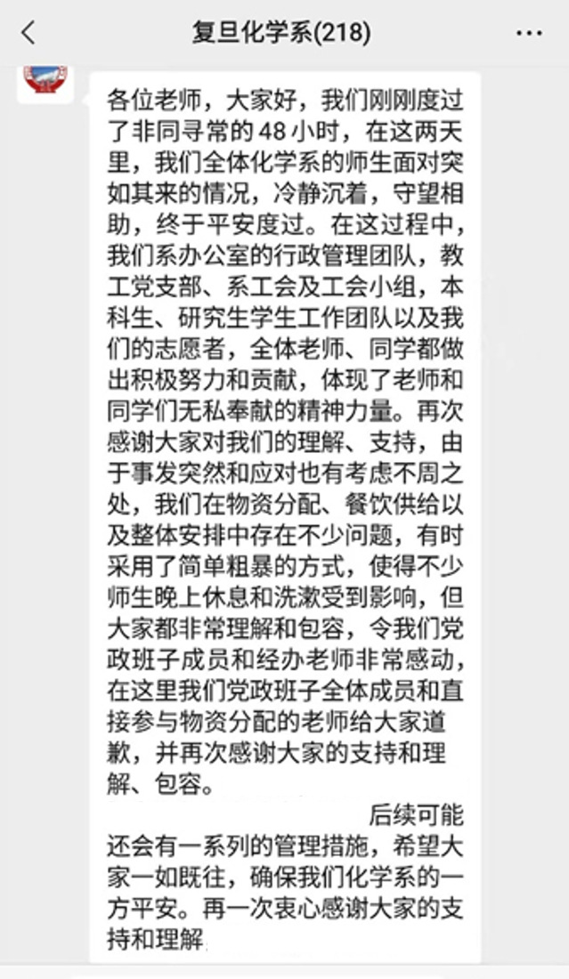 回望过去的两天,有形的记录不多,无形的点滴已经刻印在每一位亲历者心中。衷心感谢每一位奔忙在防疫一线的工作人员们,感谢每一位师生员工,每一位全力以赴、互相帮助、共同抗疫的师生,守护着h小说 48小时的平安与美好,让这段特殊的经历温暖而难忘,这段特殊的经历使每位化学人更加感受到了h小说 这个大家庭的温暖!
