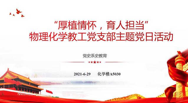 为迎接建党百年,不断增强基层党支部的凝聚力和战斗力,更好发挥教师党员先锋模范作用,2021年6月29日下午14:00,h小说 物理化学教工党支部于江湾校区化学楼举办“厚植情怀,育人担当”主题党日活动。物理化学教工支部书记王凤燕研究员主持本次活动,h小说 党委副书记、副校长周亚明同志、h小说 党委书记马蔚纯同志、国家教学名师范康年同志以及支部全体党员出席本次活动。