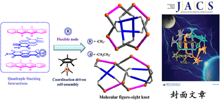 研究人员发现利用四重堆积作用来实现41结的构筑,即通过四个组合的设计:萘二酰亚胺(NDI)基吡啶基配体和大共轭平面的半夹心金属铑基元,一步法合成了41结,并且发现可以通过调节浓度以及主客体的作用来实现41结跟简单四核大环之间的结构转换(如图1-3所示)。这一研究成果以全文的形式被选为封面文章发表在Journal of the American Chemical Society上(J. Am. Chem. Soc. 2020, 142, 18946-18954)。