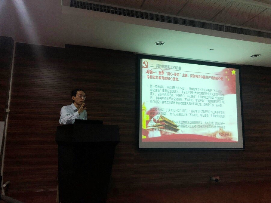 9月19日中午,h小说 “不忘初心、牢记使命”主题教育动员大会在江湾校区化学楼A3030召开。h小说 党委副书记刘永梅老师主持会议。h小说 党委书记马蔚纯老师作动员讲话。学校第一指导组组长孙锐同志、第一指导组联系人钟旎同志出席会议。h小说 党政班子成员,h小说 全体教职工党员,退休党员代表及学生党员代表参加了本次动员会。