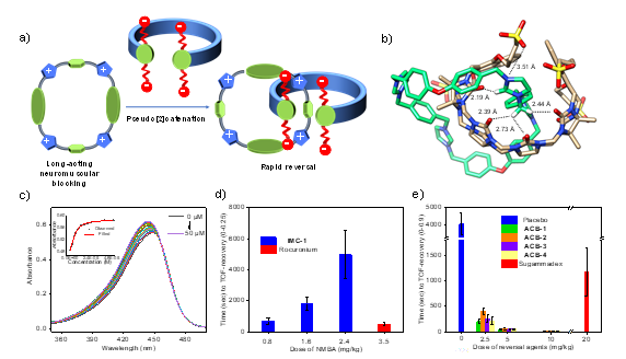 h小说 黎占亭团队近年来致力于研发针对现有临床肌松药物的通用和快速拮抗剂(J. Med. Chem. 2022, 65, 16893−16901; Chem. Sci. 2022, 13, 9243–9248)。近期研究团队利用多价性结合原理,设计合成出具有长效肌松活性的四咪唑盐大环分子。大鼠模型试验揭示,其肌松持续时间相当于临床肌松药物罗库溴铵的十倍,换算为成人肌松持续时间可超过五小时,理论上可覆盖大多数长时麻醉手术。团队又进一步设计合成出一类开环葫芦脲四羧酸盐,可以特异性结合上述咪唑盐大环,与临床快速拮抗剂舒更葡糖钠结合罗库溴铵(107 M-1)相比,结合能力高出三个数量级(1010 M-1),因此可以在任意肌松阶段快速拮抗咪唑盐大环。大鼠模型试验表明,其拮抗时间(TOF:0®0.9,17秒)显著低于舒更葡糖钠拮抗罗库溴铵的时间(TOF:0®0.9,52秒)。因此,开环葫芦脲和咪唑盐大环作为独特的主客体结合搭档,可以分别实现长时肌松和快速拮抗药物活性,为新药创制提供了一个新的研究范式。
