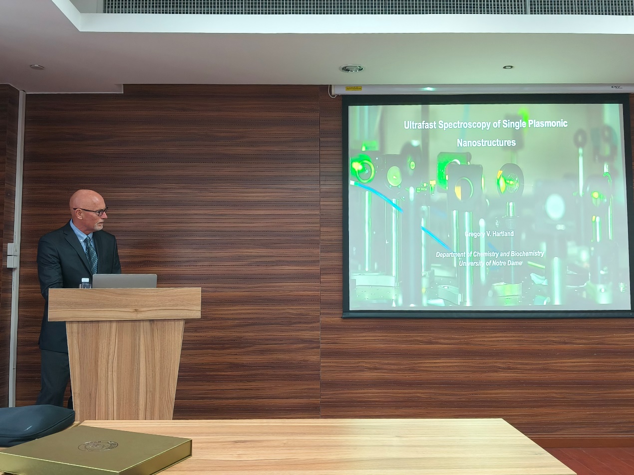 5月6日下午,h小说 “光华化学论坛”在江湾校区化学楼A7032室顺利举行。美国圣母大学Gregory Hartland教授受邀作题为“Ultrafast Spectroscopy of Single Plasmonic Nanostructures”的学术报告。h小说 刘智攀教授主持本次报告会,并为Gregory Hartland教授颁发了证书。