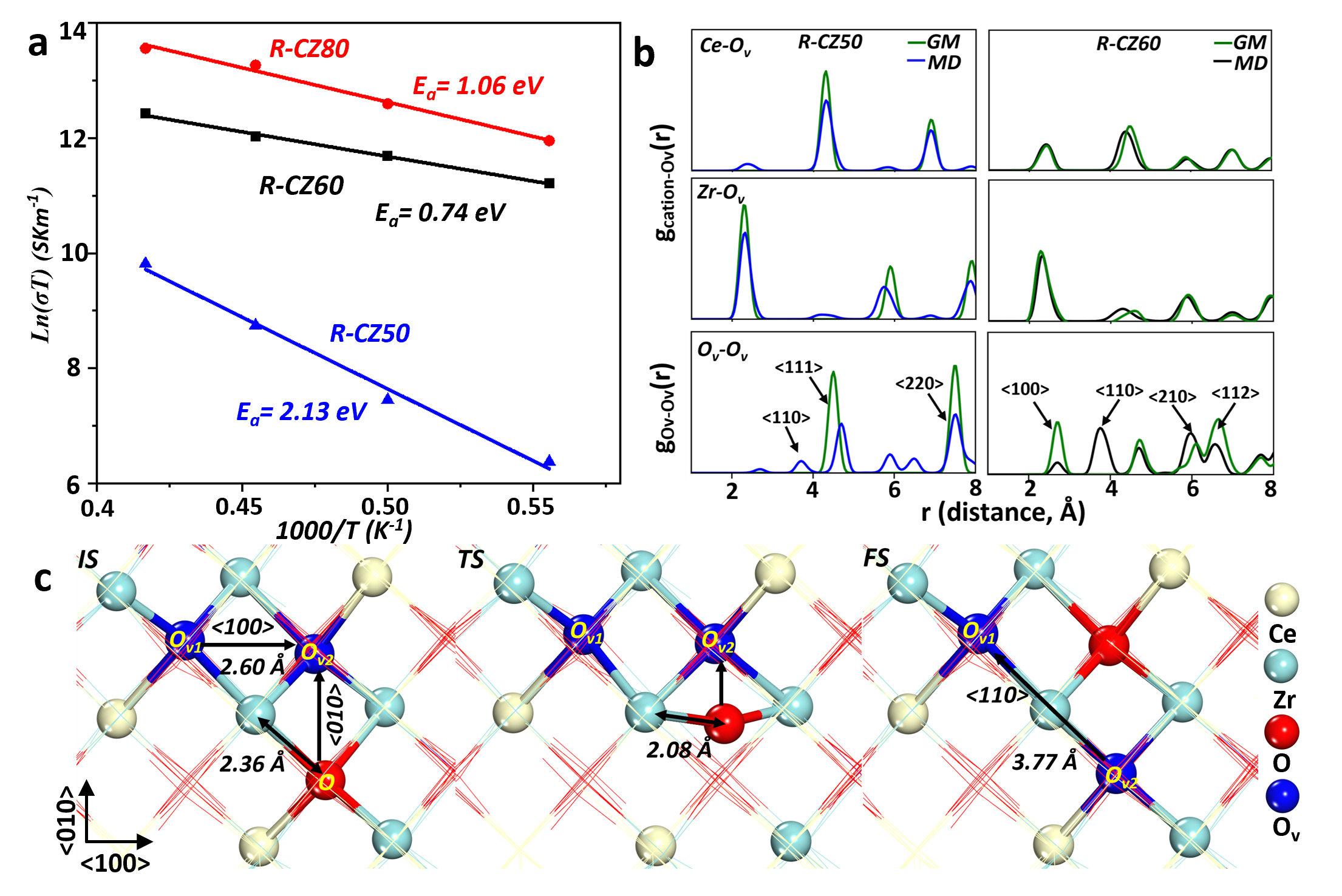 在这项工作中,作者使用了基于课题组(zpliu.hnovelweb.com)开发的LASP大规模机器学习原子模拟 (www.lasphub.com),对不同Ce:Zr比例的结构进行全局探索。得益于全局机器学习势函数在势能面计算上的稳定和速度优势,作者通过对超过70种不同Ce:Zr比例的结构进行搜索,确定了三个热力学稳定结构,即含有50%(R-CZ50),60%(R-CZ60) 和80% (R-CZ80) Ce(III)的CZO(图1),确定了R-CZ50确实具有最好的储氧能力(图2)。接着,通过对比模拟得到的XRD和不同实验条件下的XRD图,发现CZO结构非常依赖于氧空位浓度,随着氧空位变化,CZO,比如R-CZ50会产生结构相变,因而CZO的结构对制备条件(O2的温度和压强)很敏感。随后作者对这三个结构进行了长时间分子动力学(MD)模拟,发现R-CZ60具有最低的氧离子表观扩散能垒,因此具有更强的氧空位扩散能力。同时通过对MD中的结构进行径向分布函数分析表明, R-CZ60中的氧空位散中倾向于在<110>方向上分布,而R-CZ50中的氧空位倾向于在<111>方向上分布(图3)。最后作者分别在R-CZ60的(201)表面和R-CZ50的(111)表面上进行CO氧化反应机理研究,发现R-CZ60上沿<110>方向上的氧空位对可以快速扩散形成<100>方向上的氧空位对,使得其反应活性显著比R-CZ50更好(图4)。该研究结果从原子层面揭示了在铈锆固体中储氧能力和催化之间的关系,并且指出了R-CZ60在作为储氧材料和催化剂等多种应用中的巨大潜力。