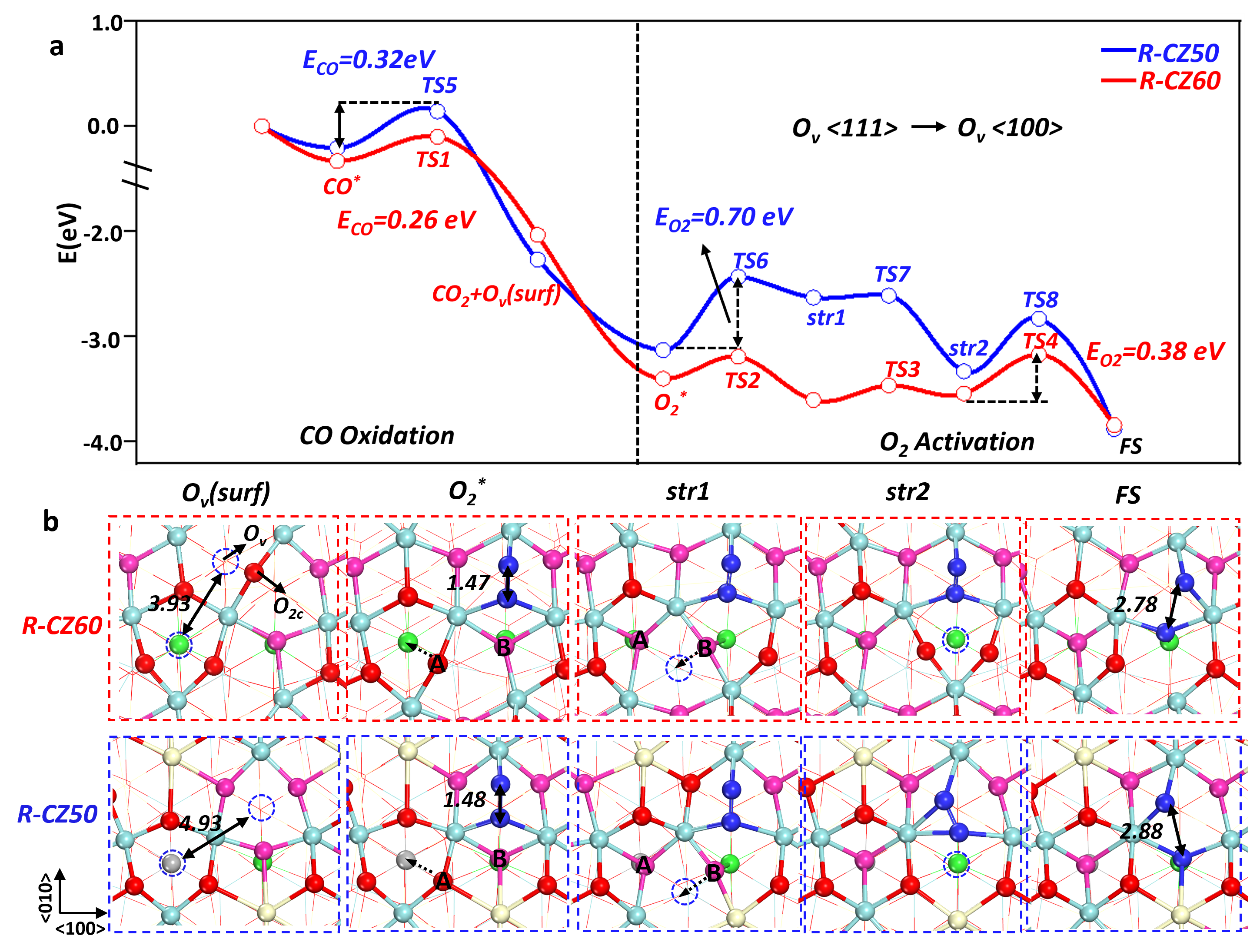 图4:两种CZO表面的催化CO氧化反应机理。