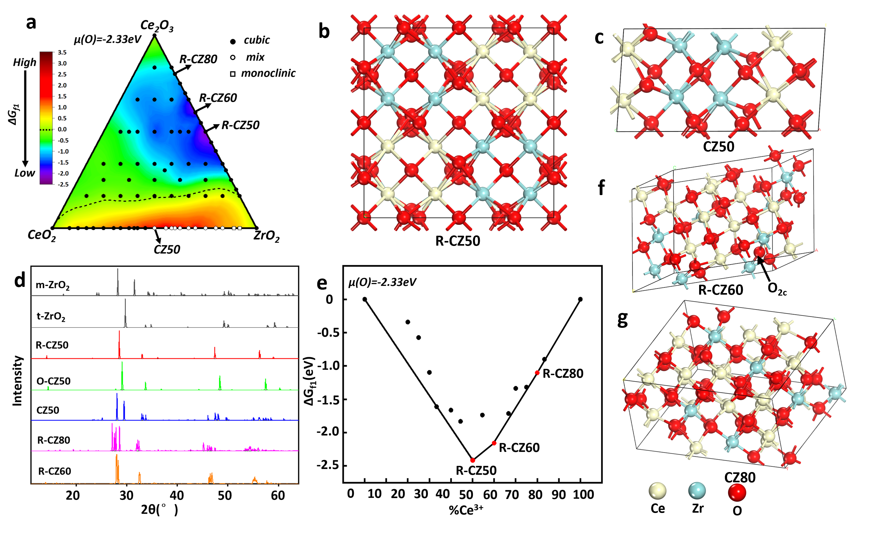 图1:铈锆氧化物固熔体的热力学相图和原子结构。