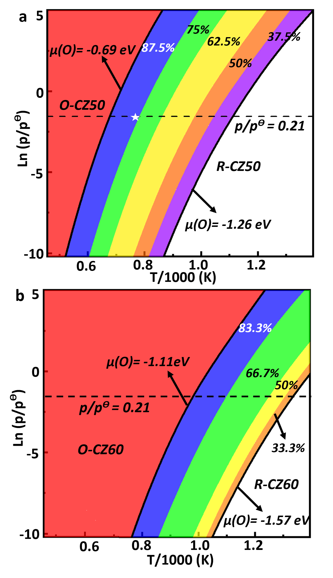 图2:R-CZ50 (a) 和 R-CZ60 (b) 在不同条件下的热力学图。