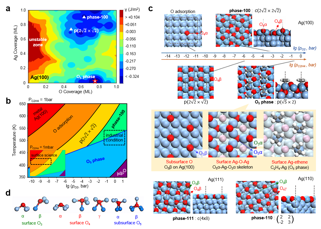 该成果报道了基于机器学习原子模拟探寻银催化乙烯环氧化活性位点的最新研究成果,发现环氧乙烷产物选择性与反应条件下Ag(100)原位生长的含有五配位次表层氧的新表面相有关的理论和实验证据。