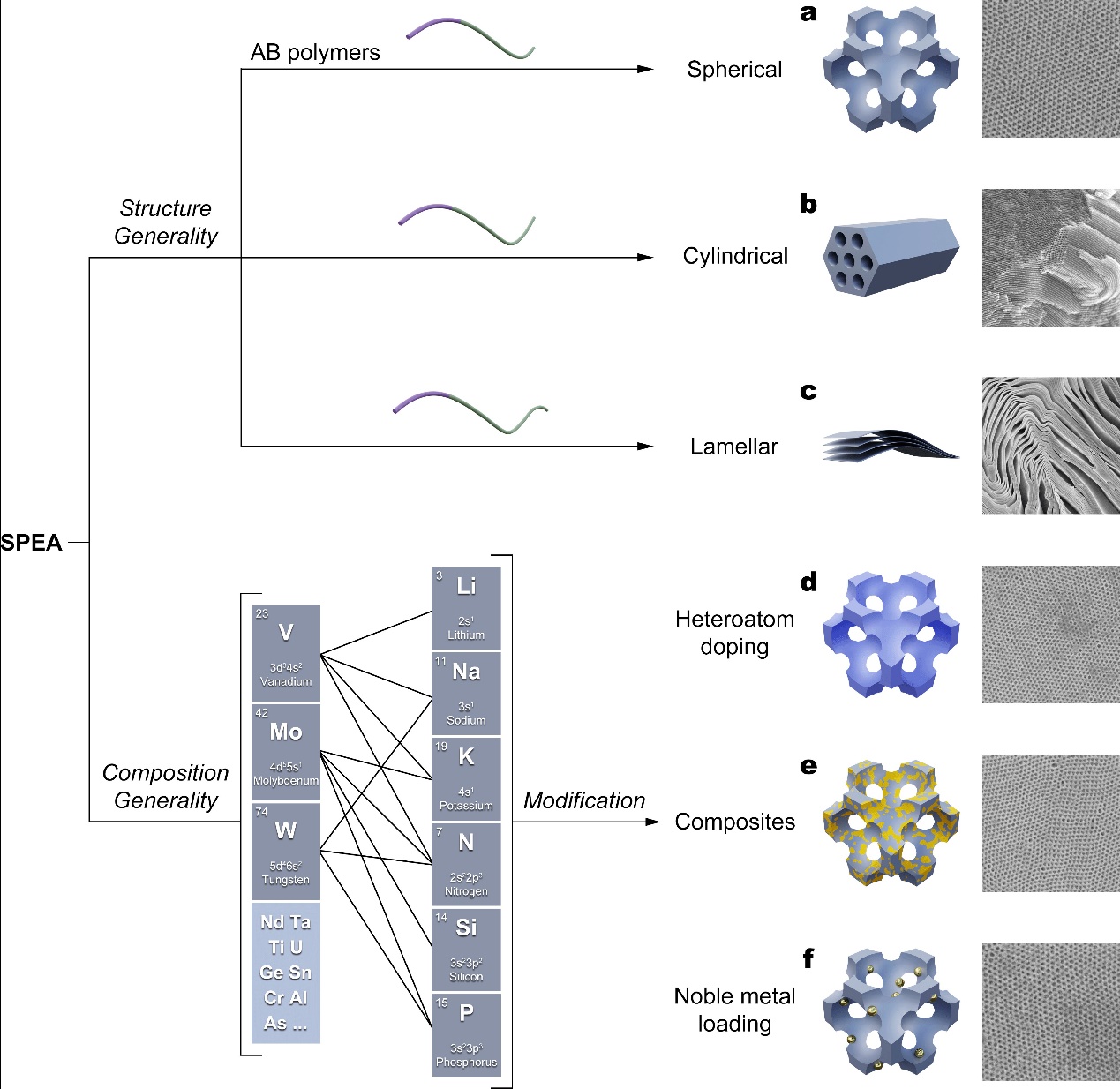得益于非直接相互作用驱动的共组装过程,可以通过简单的方式调控介孔金属氧化物的孔道结构和孔壁微环境。通过改变聚合物疏水端的链长,可以系统地调节金属氧化物介孔结构从球形、柱状到片层。以多酸团簇为主体,通过加入客体分子对前驱体组成进行拼配,可以实现对介孔金属氧化物孔壁微环境的精细调控,如杂原子掺杂、异质结构建、贵金属负载等。