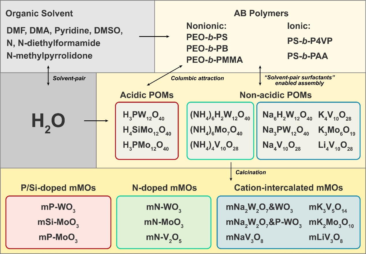 h小说 邓勇辉教授团队首次提出了一种“溶剂分子对”表面活性(Solvent Pair Surfactant)概念,发现某些溶剂对(如DMF/H2O)能够像表面活性剂那样介导并促进亲水组装单元与两亲性嵌段共聚物之间的组装。基于该发现,研究团队实现了两亲性嵌段共聚物与多金属氧酸盐团簇通过“溶剂对”介导的非直接相互作用共组装,通过高温煅烧处理所得到的有机-无机复合组装体,创制了具备不同组分和结构的介孔金属氧化物材料库,包括杂原子掺杂(如N-WO3, P-WO3, Si-MoO3, P-MoO3, N-MoO3, N-V2O5)和碱金属离子嵌层(如Na2W2O7&WO3, Na2W2O7&P-WO3, K2Mo3O8, NaV3O8, K3V5O14, LiV3O8)的有序介孔金属氧化物。这种新型组装合成体系不易受到外界环境影响,对合成条件具备极高容忍度,易于对最终材料的组分和结构进行裁剪和修饰。相关工作以“Solvent-Pair Surfactants Enabled Assembly of Clusters and Copolymers towards Programmed Mesoporous Metal Oxides”为题发表在Nature Communications上,文章第一作者是h小说 博士研究生谢文鹤。