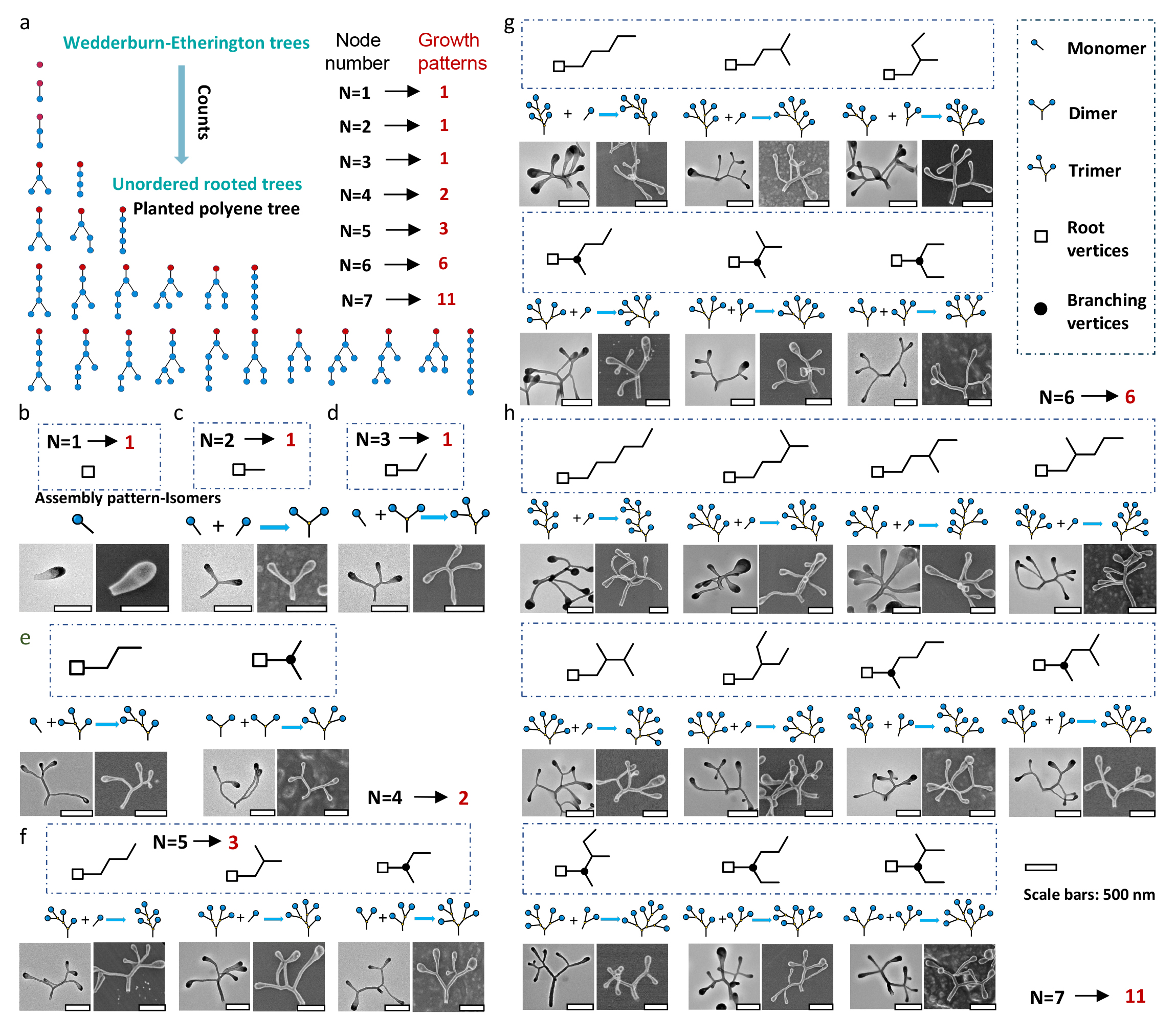 图(a)具有N个节点的无序根树的Wedderburn-Etherington 数列生长模式。(b-h) 各种含有N个C原子的有根多烯树的类型,叶数为n的分支介孔多聚体异构体的结构模型、TEM和SEM图像,其中 n 与碳原子数量相等,具体为:(b)叶数量为1,(c)叶数量为2,(d)叶数量为3,(e)叶数量为4,(f)叶数量为5,(g)叶数量为6,(h)叶数量为7。叶数量为n的分支结构的异构体的数量和构型可以准确预测和呈现,并遵循Wedderburn–Etherington数模式。