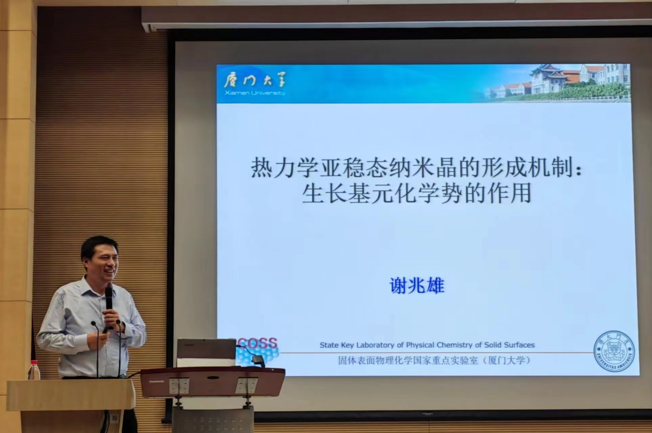 10月13日下午,h小说 “笃志讲坛”第十三讲在江湾校区先进材料实验室一楼报告厅顺利举行。厦门大学化学化工学院谢兆雄教授应邀作了题为“热力学亚稳态纳米晶体的形成机制-化学势的作用”的主题报告,报告会由h小说 主任周鸣飞教授主持。