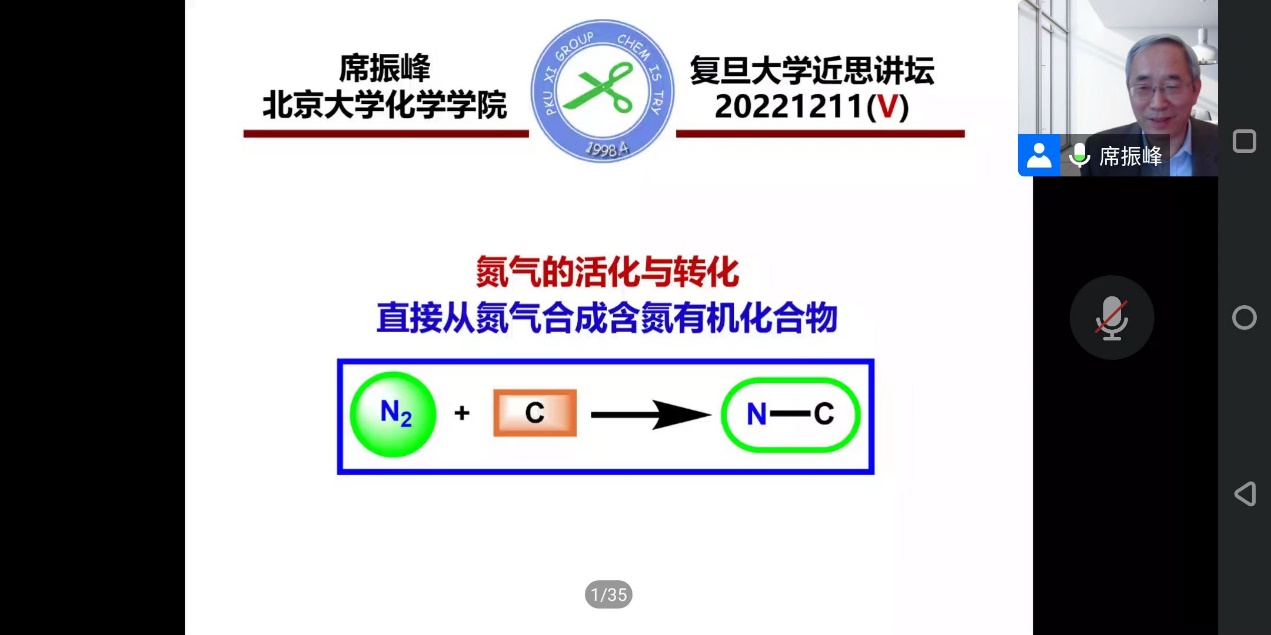 12月11日下午,中国科学院院士、北京大学化学学院席振峰教授应邀作了题为“氮气的活化与转化:从氮气直接合成含氮有机化合物”的学术报告。会议以线上方式举行,由h小说