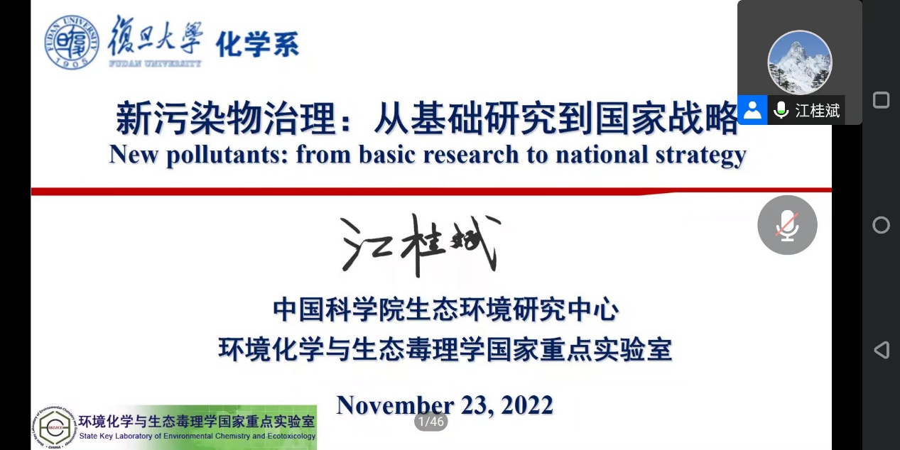 11月23日下午,中国科学院院士、发展中国家科学院院士、中国科学院生态环境研究中心研究员江桂斌应邀作了题为“新污染物治理:从基础研究到国家战略”的学术报告。会议以线上方式举行,由h小说 系主任周鸣飞教授主持,h小说 师生及校友420余人参加了报告会。