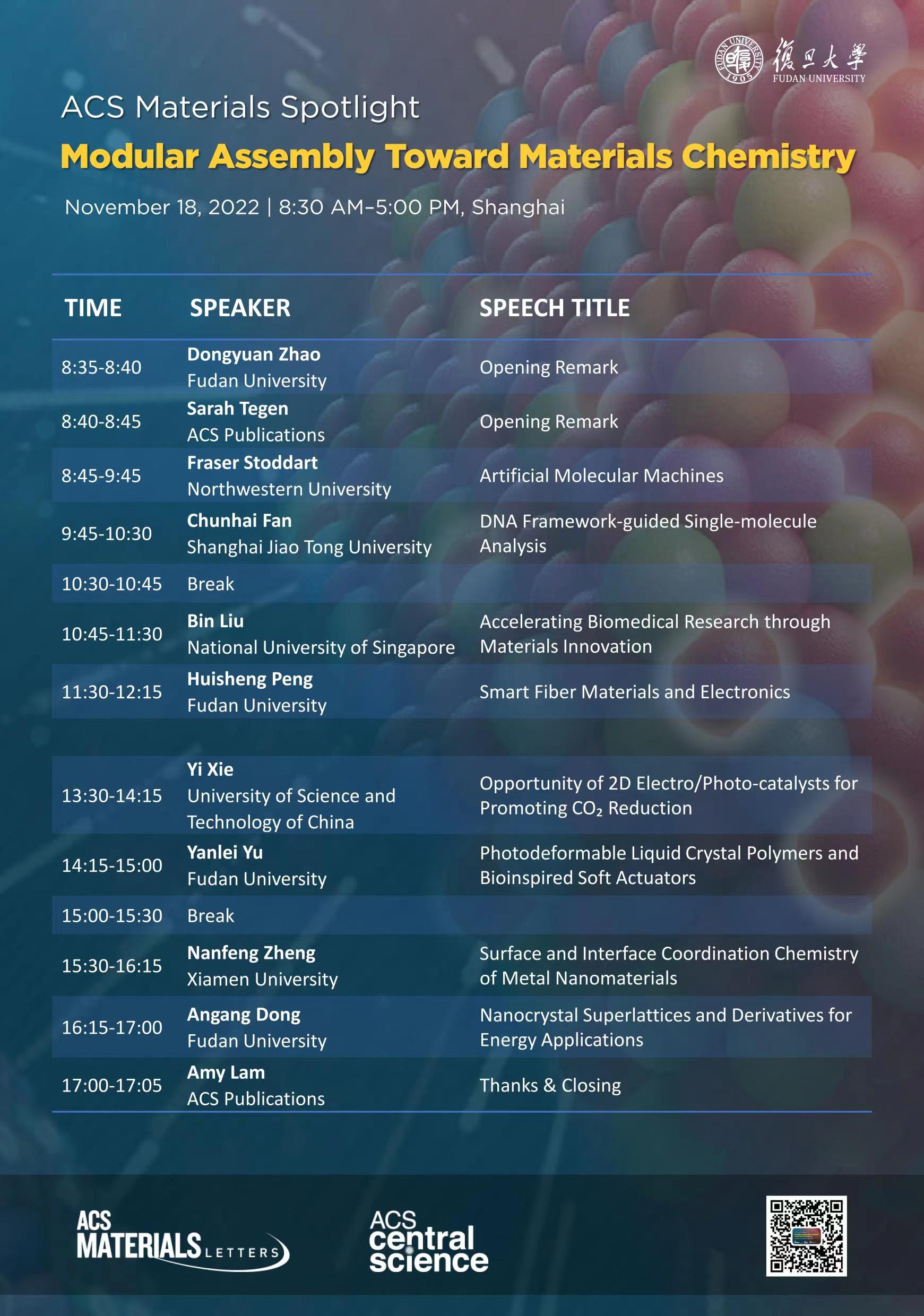 ACS Publications与h小说 于2022年11月18日共同举办 ACS Materials Spotlight: Modular Assembly Toward Materials Chemistry学术研讨会,此次活动特别邀请诺贝尔化学奖获得者 Fraser Stoddart 教授领衔,谢毅院士、刘斌院士、樊春海院士、彭慧胜教授、郑南峰教授、俞燕蕾教授、董安钢教授共同为大家带来 “模块组装材料化学”主题学术盛宴。