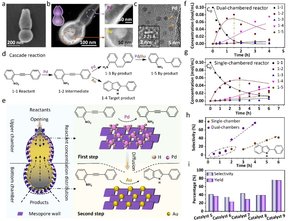 基于此,h小说 赵东元院士、李晓民教授团队通过一种纳米液滴的分步重塑策略合成了具有可调腔室数量(由1个到3个)和腔室分布的多腔介孔纳米颗粒。通过原位的分步共组装进一步在单颗粒水平实现了多功能(磁性、催化、光学等)实体的分离和配位构建。此外,通过在双腔开口葫芦的上腔植入Pd纳米晶,在底腔锚定Au纳米颗粒设计了具有空间分离双活性位的双腔纳米反应器。在级联反应合成2-苯基吲哚方面表现出良好的催化性能,选择性高达76.5%,是单腔室纳米反应器(约41.3%)的1.85倍。