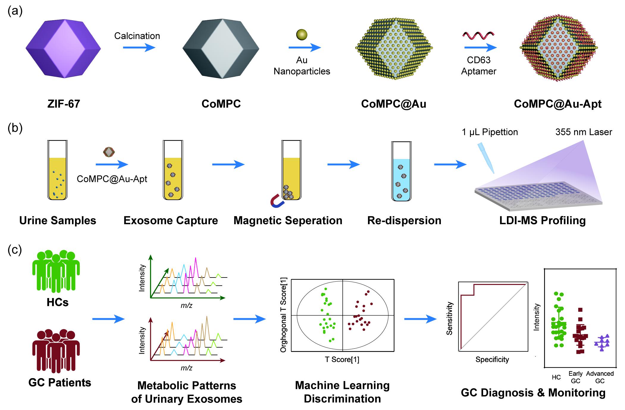 近日,h小说 邓春晖教授团队,h小说 附属中山医院沈锡中教授团队成员孙念荣副研究员报道了整合提取外泌体代谢特征用于早期胃癌检测的相关研究。本文设计合成了适配体偶联多态碳材料,可同时作为高效捕获外泌体的吸附剂以及激光解吸/电离质谱(LDI-MS)的优良基质,用于连续地富集尿液外泌体及提取其代谢特征,实现了胃癌的精确早期诊断及发展监测。