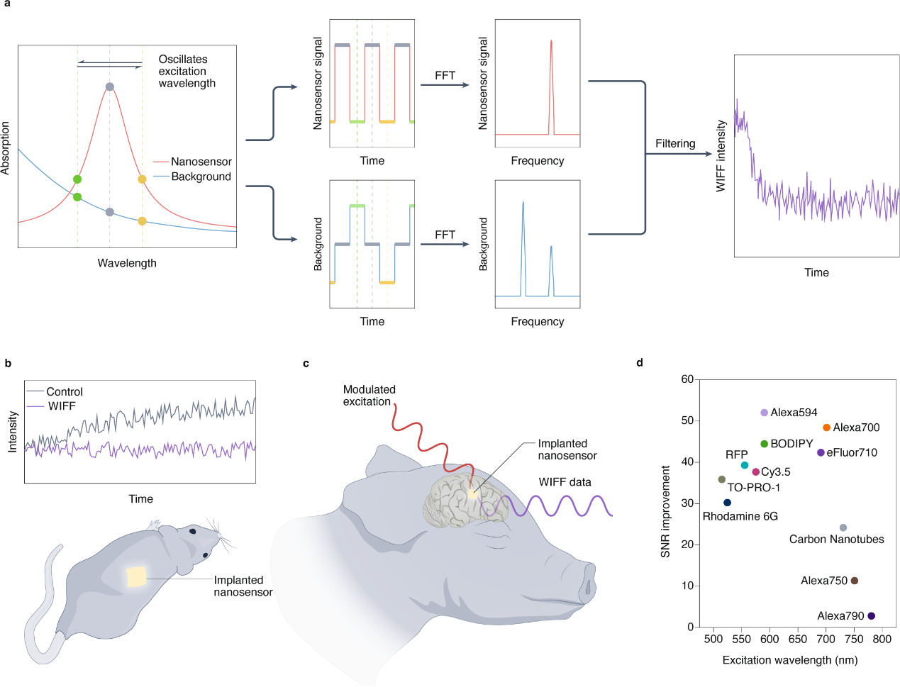 图1. 波长诱导频率滤波(WIFF)方法的原理示意图(a)及其用于活体光学传感时在克服生物运动干扰(b)、实现深组织检测(c)和探针适用性(d)方面的优势。
