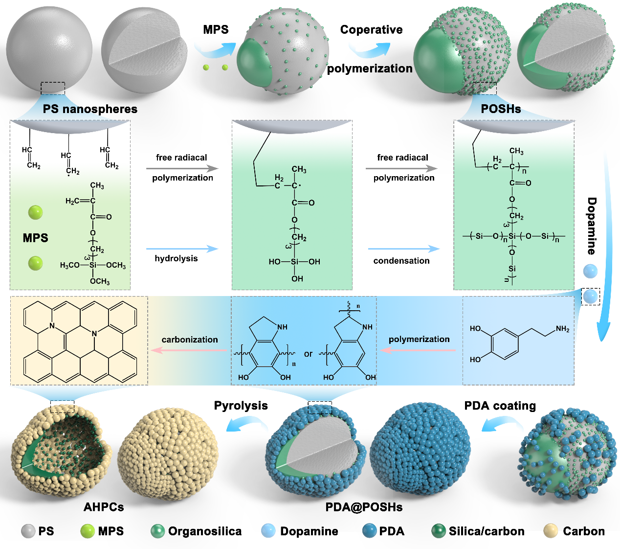 作者巧妙利用前驱体中同时发生的(烯基)自由基聚合反应和(三甲氧基硅烷)水解聚合反应,实现了有机硅在聚苯乙烯纳米颗粒表面的选择性岛状生长,随后经过包裹聚多巴胺及高温煅烧得到具有选择性中空结构的纳米机器人。此外,通过精确调控两种聚合反应的动力学,可以实现对岛状有机硅尺寸和数量等参数的精准调节,进而可以根据不同需求合成具有可调拓扑结构的多功能纳米机器人。