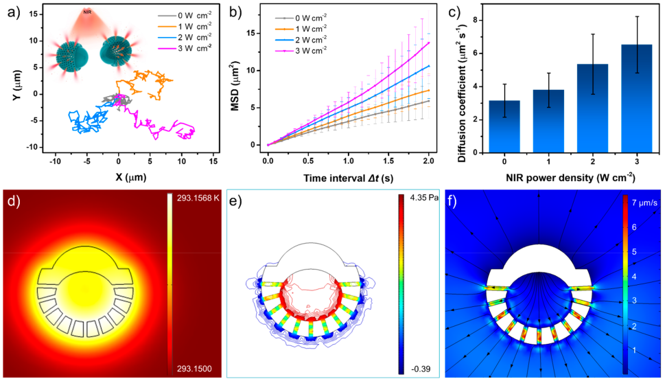 该工作开发了动力学控制的界面超组装策略,通过精确调控反应动力学,两种前驱体的竞争成核和生长导致形成不对称复合材料,最终成功地制备了具有不对称、多孔、中空结构的纳米碳材料(APHC)。APHC具有结构不对称、比表面积大、空腔大、孔道丰富、容量大、易表面修饰,负载率高等特点,同时具有优异的980 nm近红外吸收及光热效果。因此,APHC纳米颗粒可以作为一种无燃料、近红外光驱动的纳米货车。此外,DOX可以有效地装载到APHC中,并通过直接加热或近红外光热加热实现可控卸载,进一步实现化疗与光热治疗的协同治疗效果。这项工作显示可以通过调节两种及两种以上前驱体的聚合和组装反应动力学,设计开发新型多功能智能纳米材料。