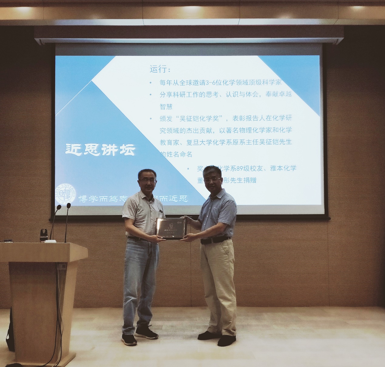 为了表彰吴奇教授在化学科研领域做出的卓越贡献,h小说 系主任贺鹤勇教授代表“近思讲坛”组委会向吴奇教授颁发了“吴征铠化学奖”,以此激励与会师生积极探索、努力奋斗,继续推动h小说 化学学科向前发展。h小说 “近思讲坛”的举办和“吴征铠化学奖”的设立得到了雅本化学Wholly You和h小说 1989级系友蔡彤先生的大力支持。