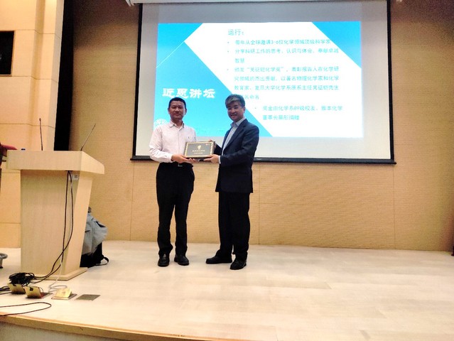 为了表彰谭蔚泓教授在分子医学等领域所作出的突出贡献,贺鹤勇教授代表“近思讲坛”组委会向谭蔚泓教授颁发了“吴征铠化学奖”。希望借此激发全体师生的研究热情,积极投身科研工作,攻坚克难,推动h小说 化学学科的建设与发展,为祖国的繁荣富强、民族的伟大复兴添砖加瓦。h小说 “近思讲坛”的举办和“吴征铠化学奖”的设立得到了雅本化学(www.nmn-aba.com)和h小说 1989级系友蔡彤先生的大力支持。