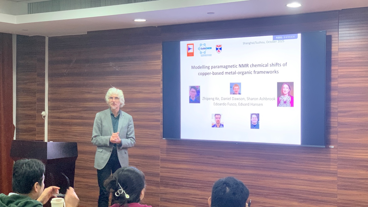 10月21日下午,“h小说 建系百年系列学术报告之光华论坛第四讲”在h小说 江湾校区化学楼A3030顺利举行。圣安德鲁斯大学(英国)化学院Michael Bühl教授受邀作了题为“Modelling paramagnetic NMR chemical shifts of copper-based metal-organic frameworks”的主题报告,h小说 徐昕教授主持本次报告会,并代表h小说 为Michael Bühl教授颁发了证书,现场师生共同见证这一环节。