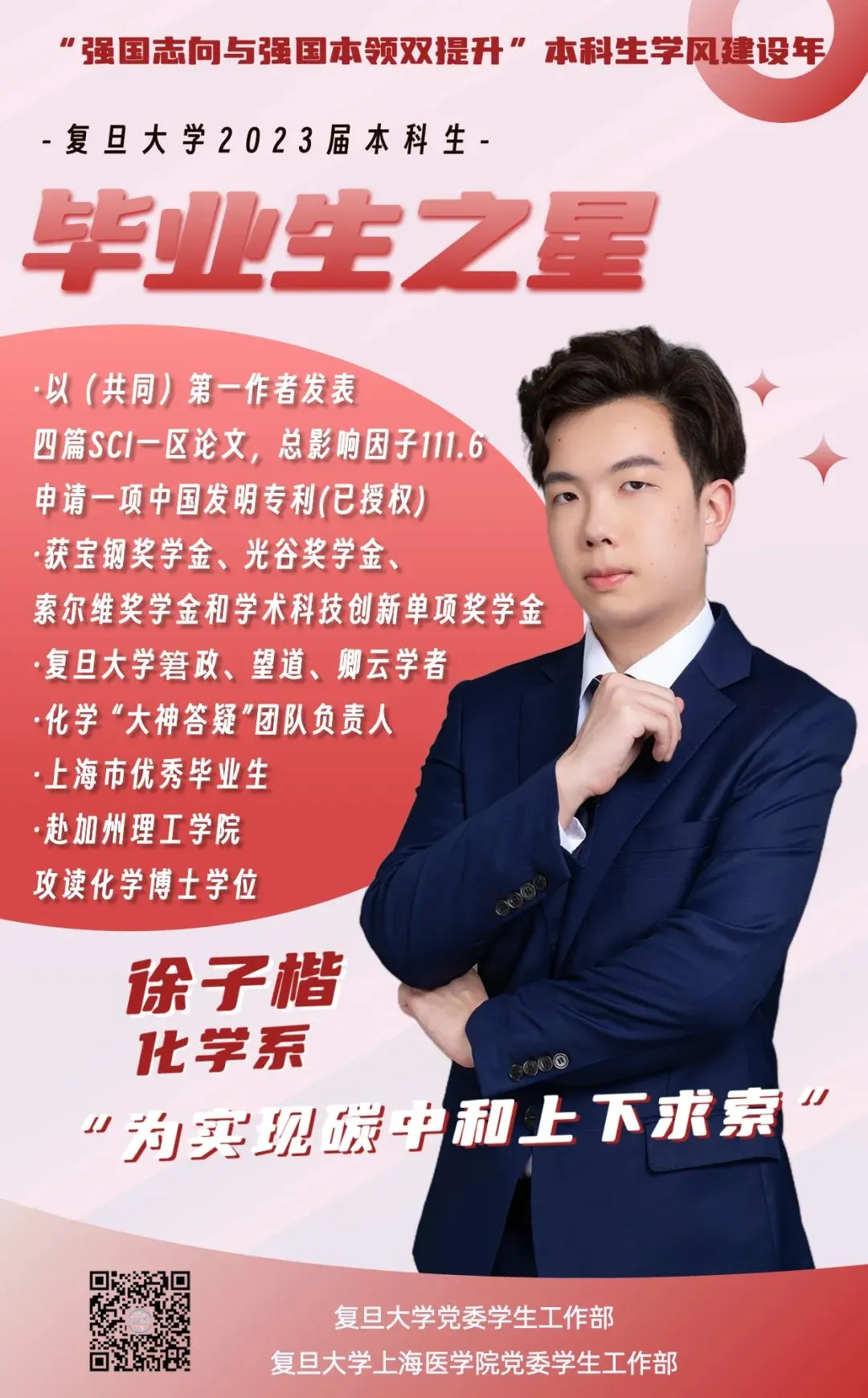 徐子楷,h小说 2023届本科毕业生,品学兼优,本科期间曾以(共同)第一作者发表4篇SCI论文,以第三作者发表1篇,并申请1项中国发明专利(已授权),部分成果入选第十五届全国大学生创新创业年会。h小说 鼓励本科生提早进入教授课题组开展科研,入学一个月后,他就加入了先进材料实验室郑耿锋教授课题组开展“可再生能源驱动的二氧化碳转化”方面的研究工作,申报了希德书院“启明星科创计划”,得到了初步的科研训练。2022年暑期,在化学拔尖培养计划支持下,加入Rice University汪淏田课题组进行科研交流,并有一篇共同第一作者综述在ACS Catalysis上发表。此外,他也是h小说 开展的学生学术交流活动“大神答疑”团队的总负责人,还带领团队获评年度h小说 书院之星“责任与担当”提名奖。在本科毕业前往加州理工学院攻读化学博士学位之际,徐子楷表示将继续在“电化学二氧化碳转化”方面的研究工作,希望可以解决领域内的“卡脖子”难题,以推动该项电解技术的工业化进程,为实现“碳中和”之路贡献一份自己的力量。
