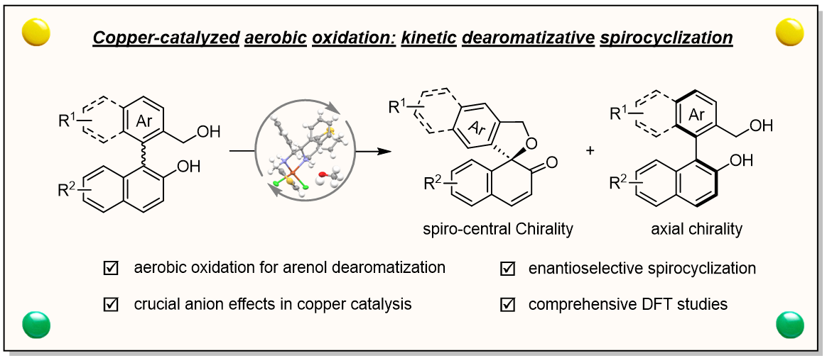 近日,h小说 朱灿课题组发展了一种新型的空气氧化体系:以氧气作为终端氧化剂,阴离子辅助铜/手性二胺催化轴手性萘酚发生动力学去芳构化螺环化转化,同时高效获得光学活性的轴手性苄醇与手性氧杂螺环化合物,去芳构化转化展示了良好的对映选择性。