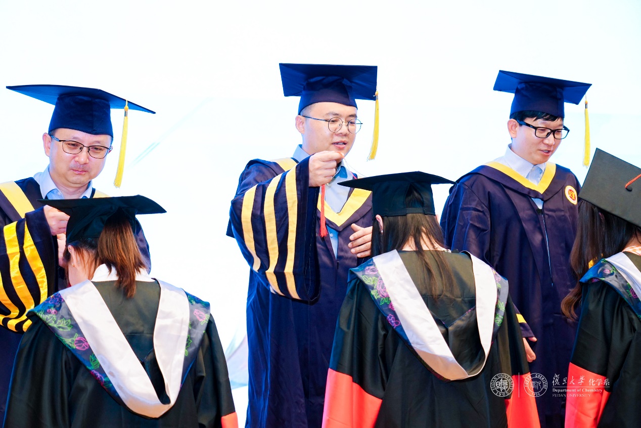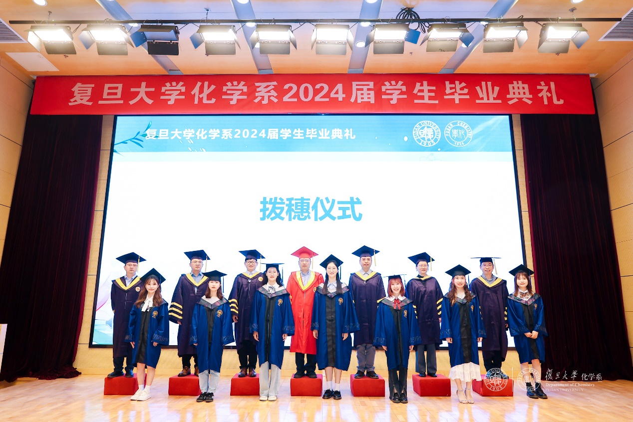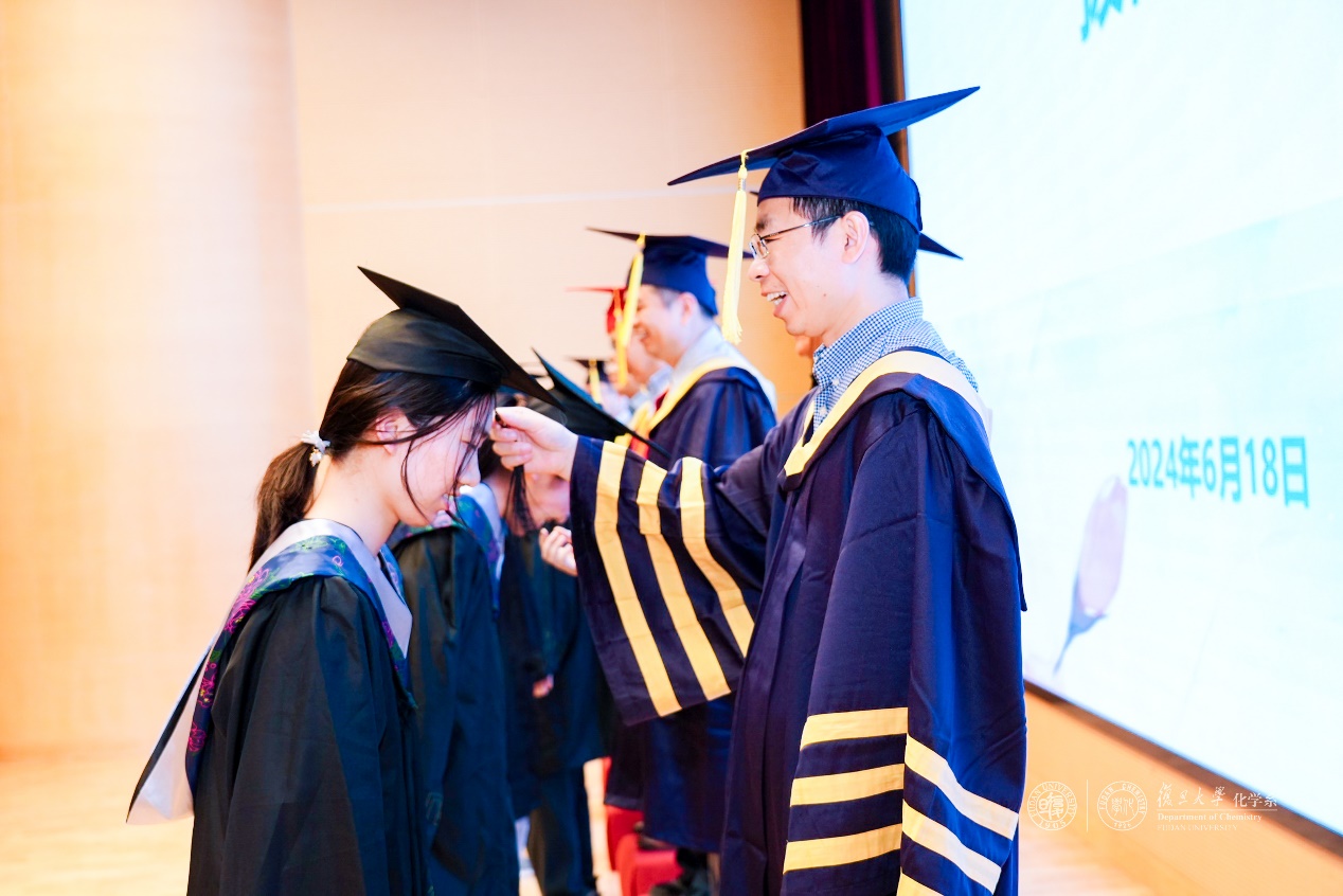 随后,拨穗仪式隆重举行。2024届博士、硕士、本科毕业生依次上台由化学学科学位评定委员会、学术委员会代表和导师代表为毕业生拨穗。毕业生们学位帽上的流苏由右侧拨至左侧,标志着一个阶段的结束,更标志着整装待发,迎接新征程的开始。