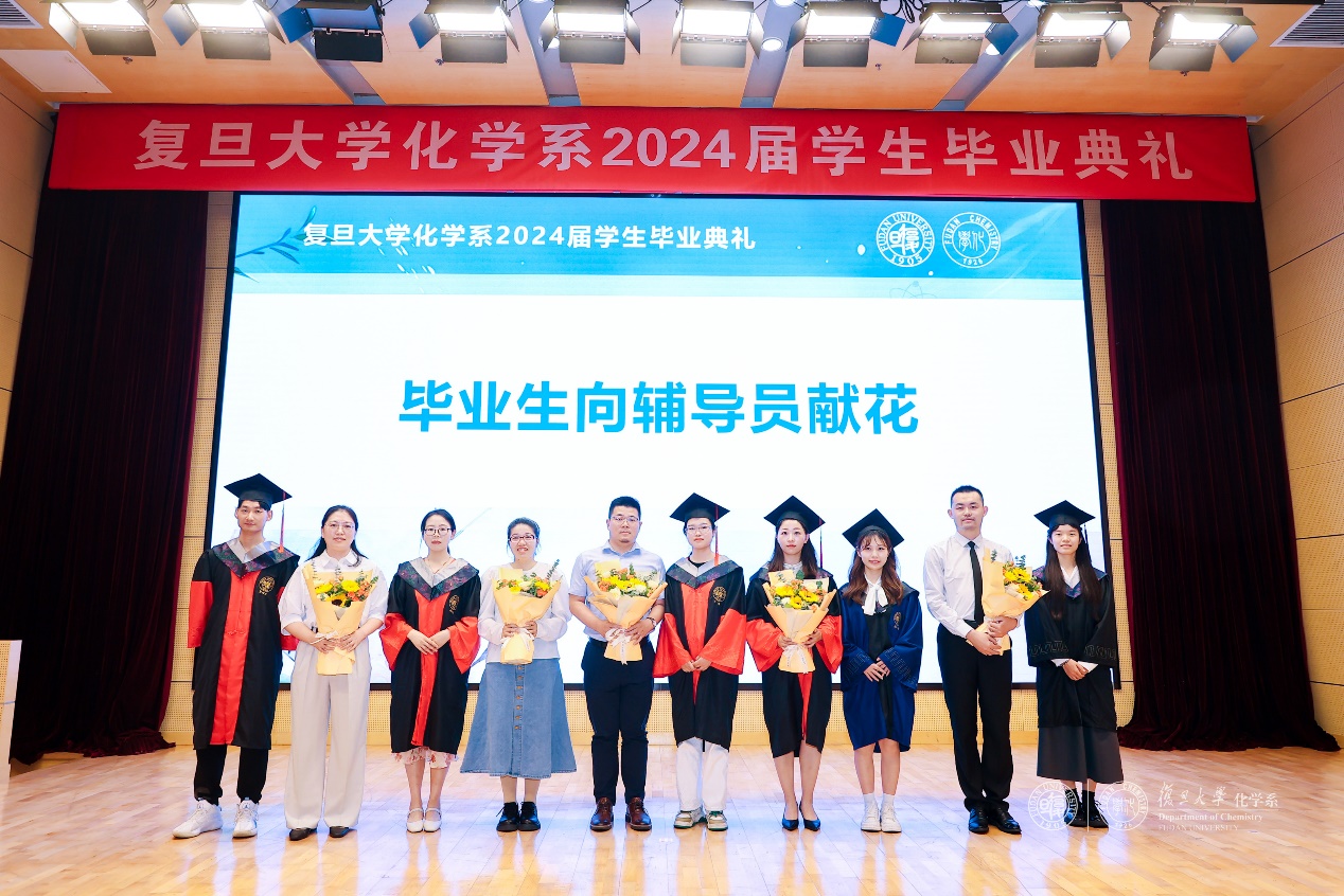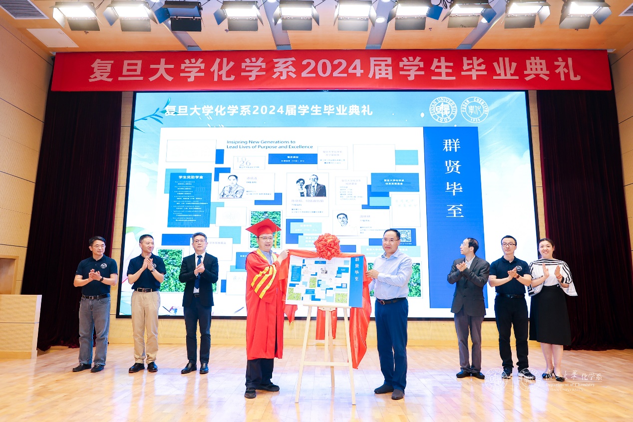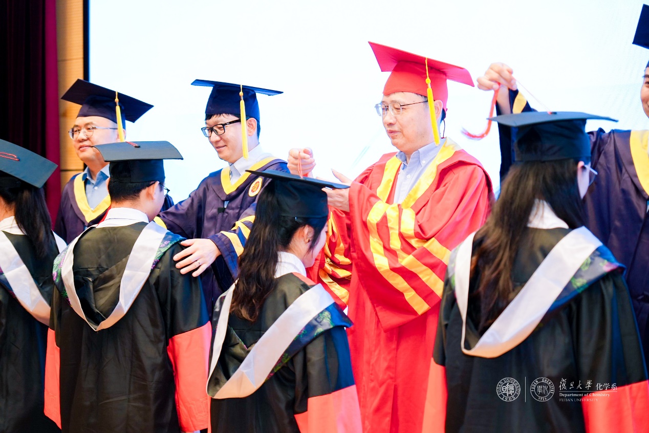 随后,拨穗仪式隆重举行。2024届博士、硕士、本科毕业生依次上台由化学学科学位评定委员会、学术委员会代表和导师代表为毕业生拨穗。毕业生们学位帽上的流苏由右侧拨至左侧,标志着一个阶段的结束,更标志着整装待发,迎接新征程的开始。
