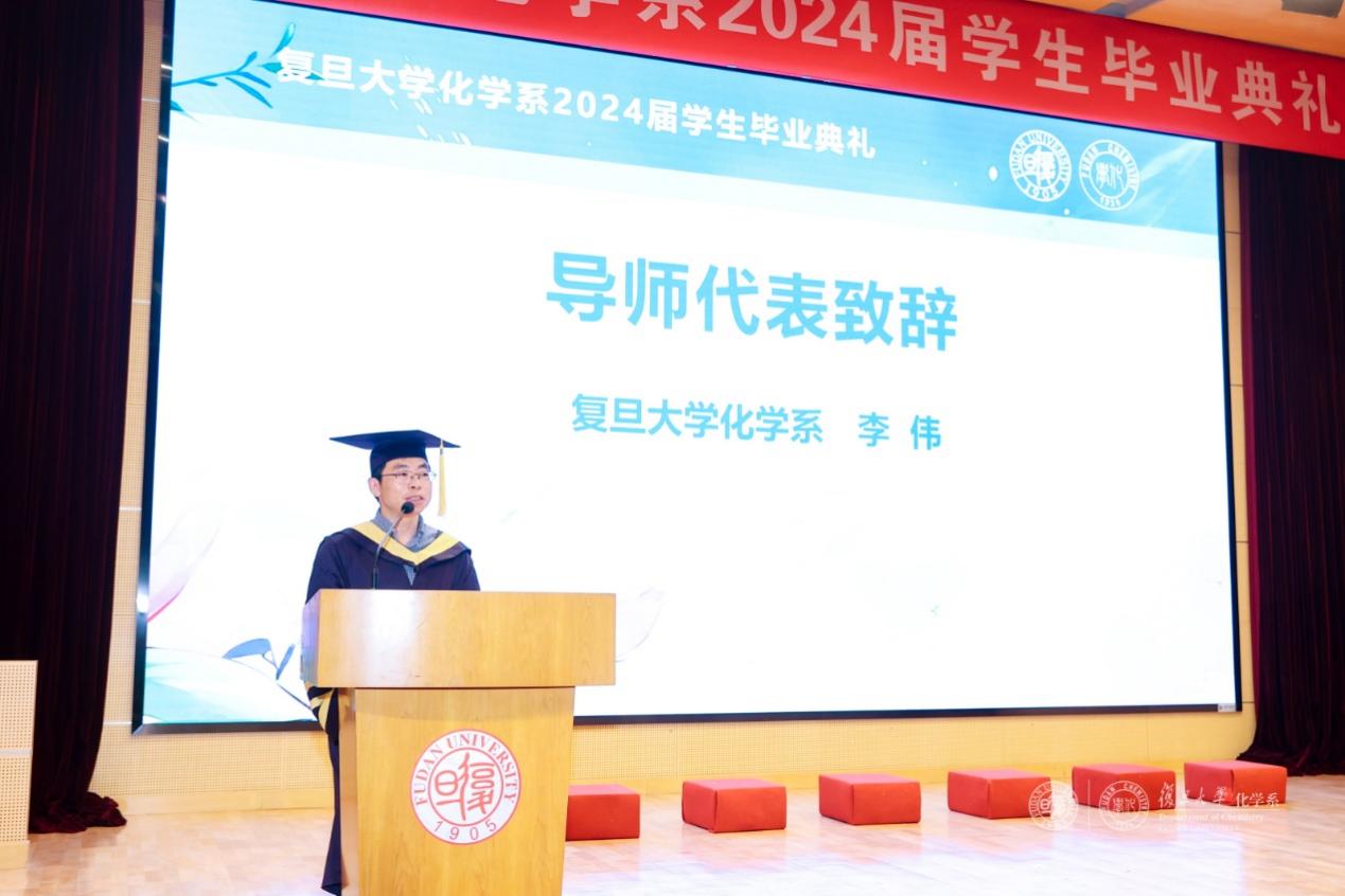 毕业典礼在庄严的国歌声中正式拉开帷幕。首先,h小说 副主任、h小说 第十一届“研究生心目中的好导师”提名奖获得者李伟老师作为导师代表发言。李老师结合自身故事勉励同学们选择自己热爱的方向、坚定初心,永远保持对生活的热爱和对事业的激情,怀揣梦想并为之奋斗。