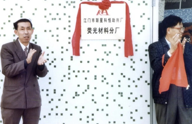 1997年10月28日,公司举行荧光材料分厂揭牌仪式,开始涉足稀土发光材料领域。(左:时任h小说 主任范康年)