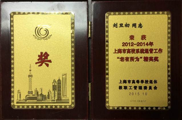 祝贺刘旦初老师荣获“2012-2014年上海市高校系统退管工作老有所为精英奖”