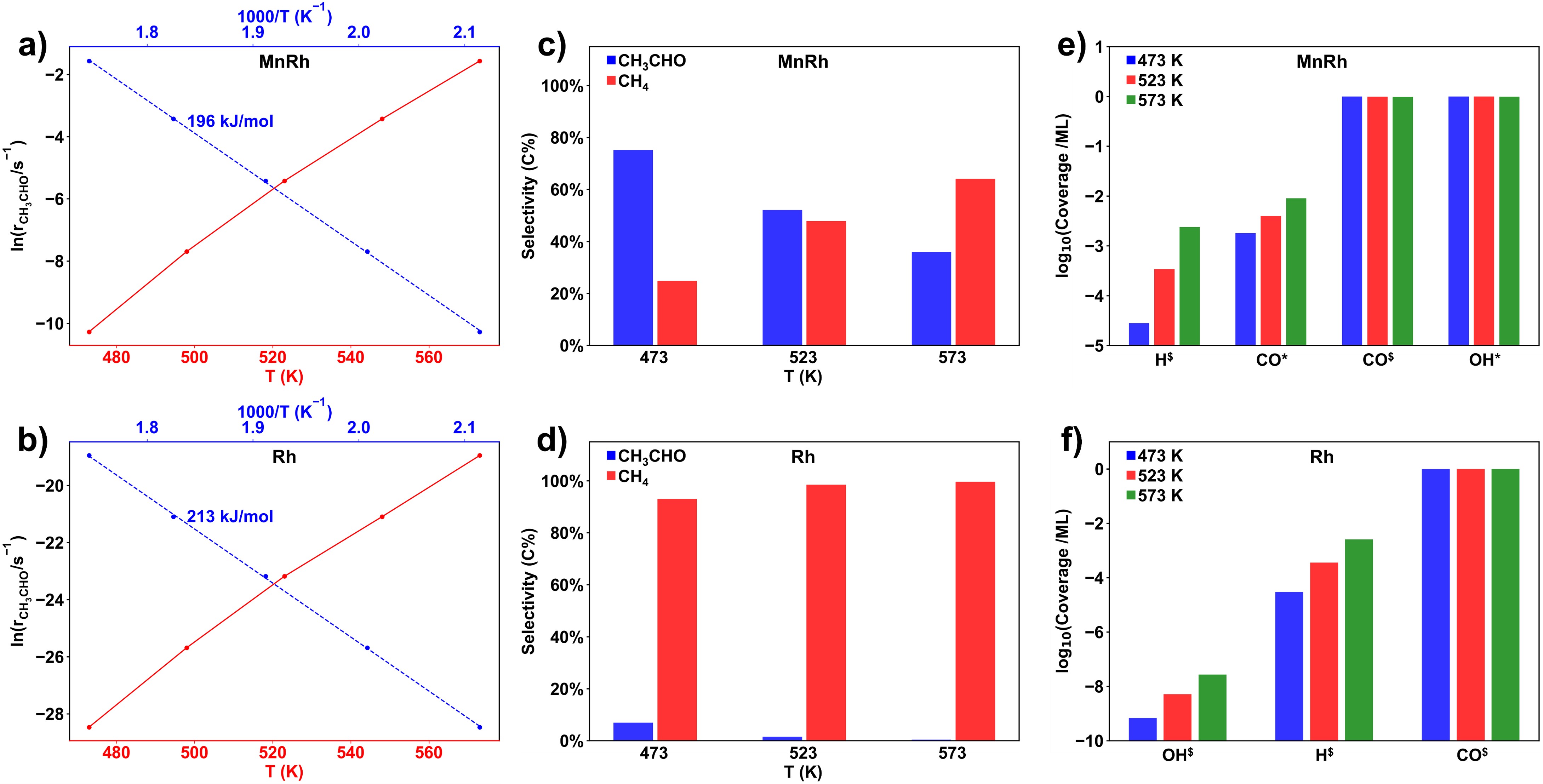 图5:Rh(211)和MnRh(211)表面上反应的微观动力学模拟。