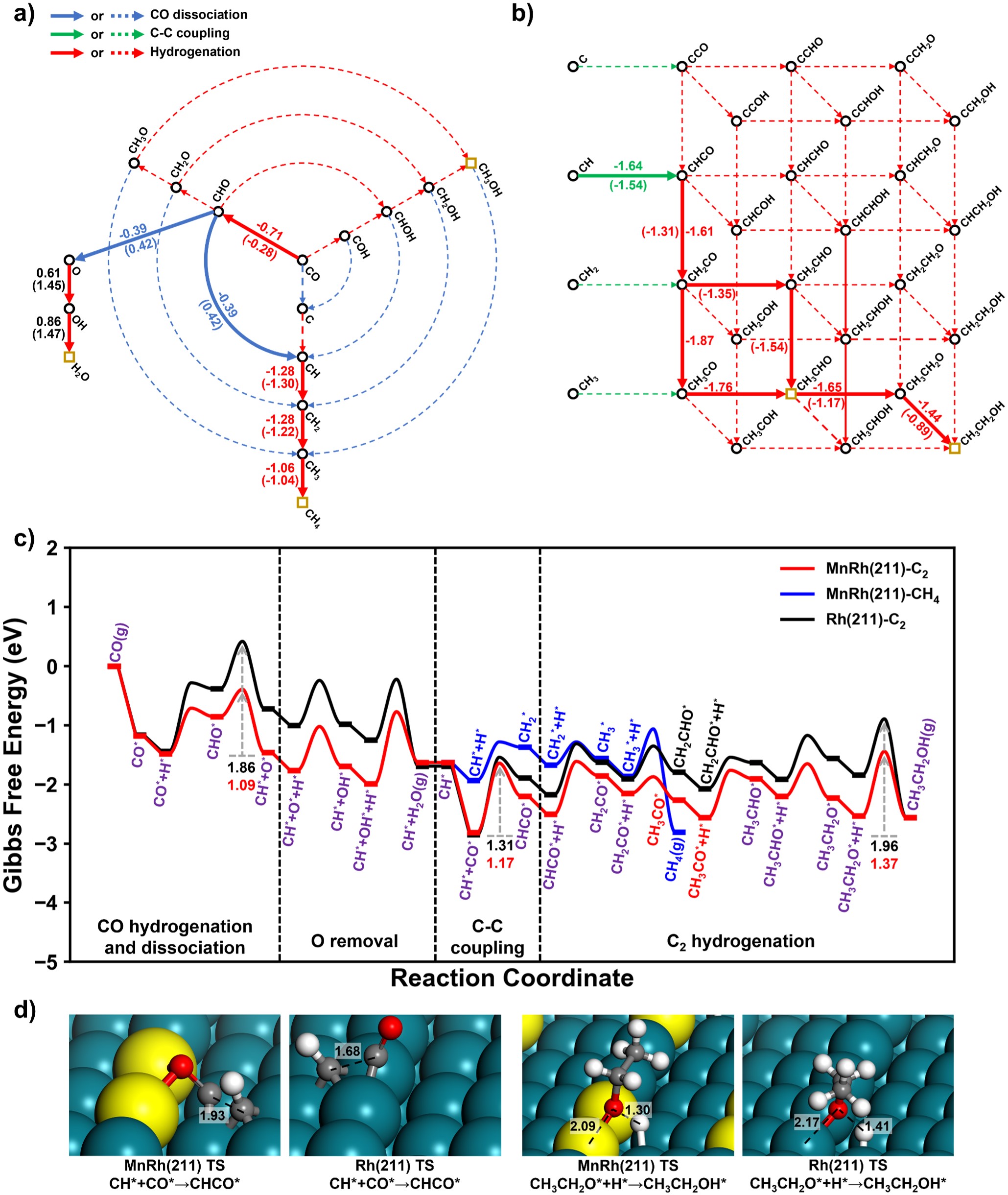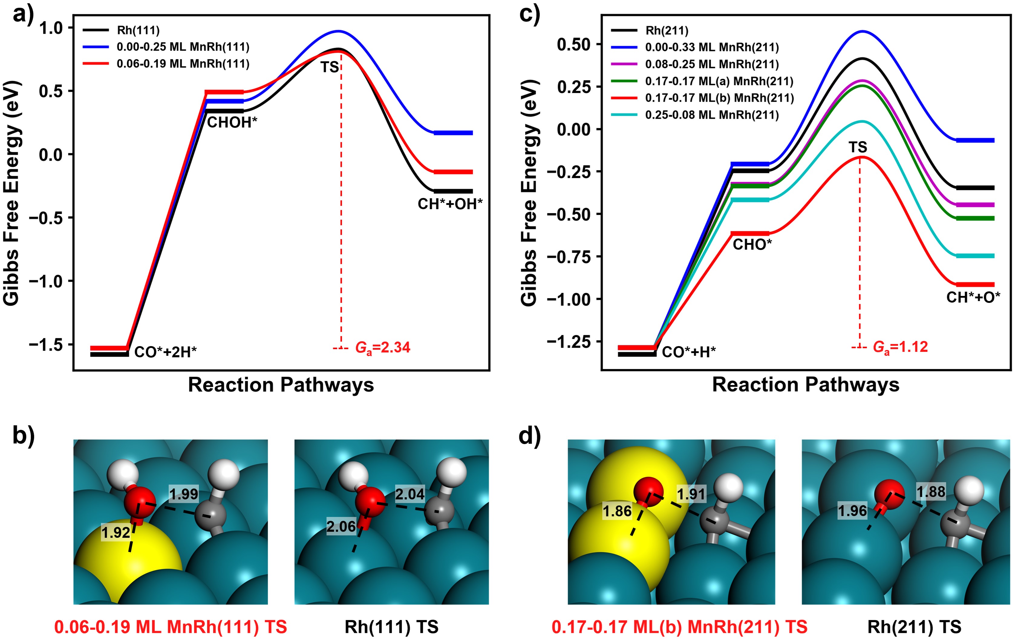 图3:Rh(211)和MnRh(211)表面CO氢化反应具有最低能垒的反应路径。
