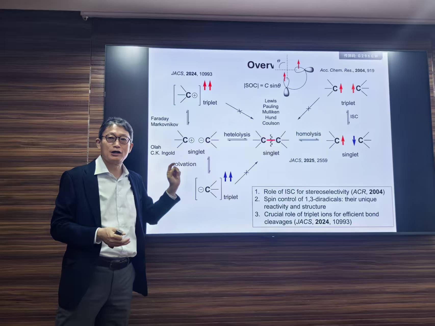 Abe教授长期致力于高能中间体、奇特自旋态分子的反应性及其理论基础研究,在卡宾、双自由基及π-单键分子等方向具有国际领先贡献。报告伊始,Abe教授从电子自旋操控(Electron Spin Manipulation)切入,介绍了自旋态在反应选择性、键断裂效率及分子构型中的关键作用。他系统梳理了从双自由基的产生、单重态到三重态的相互转换、反应路径的改变以及在量子化学与分子设计中的潜在应用。