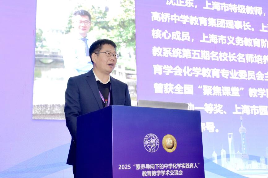 上海市高桥中学沈正东校长代表学校及五家承办基地,向莅临现场的各位领导、专家与教师致以热烈欢迎和衷心感谢。他回顾了学校在创建上海市实验性示范性高中、推进“双新”实验项目、开展课程领导力行动研究等工作中取得的丰硕成果,着重强调了学校在化学教学领域的积极探索与创新实践。