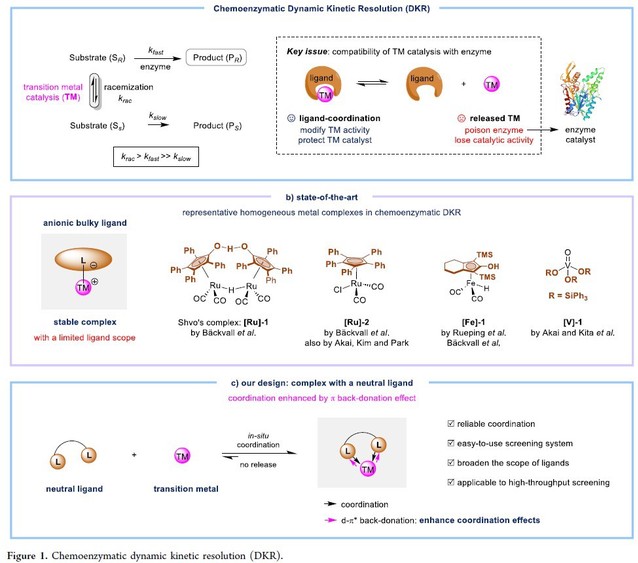 化学酶法的动态动力学拆分(DKR)将金属催化与酶催化的优势相结合,已成发展为外消旋体转化为光学活性手性化合物的优秀解决方案,然而双催化体系的兼容性是关键问题。传统的解决方案依赖大位阻、阴离子型配体,预制形成稳定的金属络合物来保护金属中心,避免与酶催化剂相互干扰与毒化;但也极大地限制了配体与金属催化剂的范围。