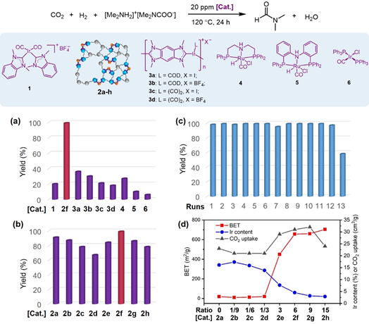 The valorization of carbon dioxide (CO2) to fine chemicals is one of the most promising approaches for CO2 capture and utilization. Herein we demonstrated a series of porous organometallic polymers could be employed as highly efficient and recyclable catalysts for this purpose. Synergetic effects of specific surface area, iridium content, and CO2 adsorption capability are crucial to achieve excellent selectivity and yields towards N-formylation of diverse amines with CO2 and H2 under mild reaction conditions even at 20 ppm catalyst loading. Density functional theory calculations revealed not only a redox-neutral catalytic pathway but also a new plausible mechanism with the incorporation of the key intermediate formic acid via a proton-relay process. Remarkably, a record turnover number (TON = 1.58 × 106) was achieved in the synthesis of N,N-dimethylformamide (DMF), and the solid catalysts can be reused up to 12 runs, highlighting their practical potential in industry.