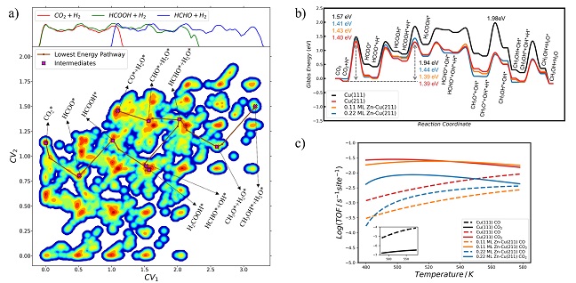 Methanol synthesis on industrial Cu/ZnO/Al2O3 catalysts via the hydrogenation of CO and CO2 mixture, despite several decades of research, is still puzzling due to the nature of the active site and the role of CO2 in the feed gas. Herein, with the large-scale machine learning atomic simulation, we develop a microkinetics-guided machine learning pathway search to explore thousands of reaction pathways for CO2 and CO hydrogenations on thermodynamically favorable Cu–Zn surface structures, including Cu(111), Cu(211), and Zn-alloyed Cu(211) surfaces, from which the lowest energy pathways are identified. We find that Zn decorates at the step-edge at Cu(211) up to 0.22 ML under reaction conditions with the Zn–Zn dimeric sites being avoided. CO2 and CO hydrogenations occur exclusively at the step-edge of the (211) surface with up to 0.11 ML Zn coverage, where the low coverage of Zn (0.11 ML) does not much affect the reaction kinetics, but the higher coverages of Zn (0.22 ML) poison the catalyst. It is CO2 hydrogenation instead of CO hydrogenation that dominates methanol synthesis, agreeing with previous isotope experiments. While metallic steps are identified as the major active site, we show that the [−Zn–OH–Zn−] chains (cationic Zn) can grow on Cu(111) surfaces under reaction conditions, which suggests the critical role of CO in the mixed gas for reducing the cationic Zn and exposing metal sites for methanol synthesis. Our results provide a comprehensive picture on the dynamic coupling of the feed gas composition, the catalyst active site, and the reaction activity in this complex heterogeneous catalytic system.
