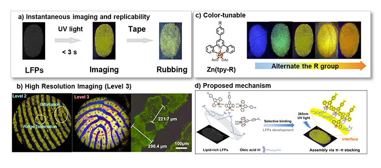 Instant visualization of latent fingerprints is developed by using a series of water-soluble terpyridine zinc complexes as aggregation-induced emission probes in pure water, under UV light or ambient sunlight. By simply soaking, or spraying with an aqueous solution of the probe, bright yellow fluorescence images with high contrast and resolution are readily developed on various surfaces including tinfoil, glass, paper, steel, leather, and ceramic tile. Remarkably, latent fingerprints can be visualized within seconds including details of whorl and sweat pores. The color of emission can be tuned from blue to orange by modifying the pincer ligands, allowing direct imaging under sunlight. These inexpensive, water-resistant, and color-tunable probes provide a practical approach for latent fingerprints recording and analysis, security protection, as well as criminal investigation in different scenarios.