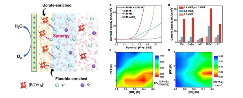 The ion-enriched electrode-electrolyte interface is a unique characteristic of electrocatalytic reactions that can effectively tune the local chemical environment. In this study, we discovered a strong synergy between borate and fluoride anions for water oxidation in neutral conditions. Under an optimal ratio of the two anions, the water oxidation current significantly outperforms the individual counterparts by almost an order of magnitude. This synergy was greatly attributed to the hierarchical anions at the interface, with borate approaching the surface and fluoride extending out, as revealed by in situ surface-enhanced Raman spectroscopy and molecular dynamics simulation. This hierarchical anion arrangement created two kinetics regions, with one borate-dominating region to lower the onset potential and one fluoride-dominating region to sustain a larger current. Using the synergized electrolyte, a low-cost and facilely synthesized Co(OH)2 electrode could achieve an outstanding performance of 100 mA/cm2 at 1.791 V versus RHE under pH = 7.87 with a 2-week-long durability.