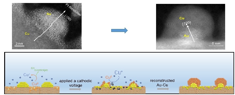 Interfacing Cu with a secondary metal is an effective strategy to enhance the production of value-added C2+ fuels in CO2 electroreduction. However, such a biphasic interface generally suffers unclear dynamic reconstruction/phase transformation, rendering the structure-function correlation elusive. Here, we studied a model system of epitaxial Au–Cu heterostructure, which exhibits a ∼150 mV more positive onset potential for C2+ alcohols and a 400-fold improved alcohols production over hydrocarbons, relative to primitive Cu. We unambiguously revealed a dynamic restructuring of such heterostructure, from phase-separated bimetals to alloy-supported core-shell nanoclusters, driven by the oxidation/reduction of Cu(0) at the interface. A distinct tandem mechanism was proposed, and the buildup of ∗CO was identified as crucial to keeping the production durability of C2+ alcohols. This work fills in the voids of direct observation on the dynamic restructuring of the bimetallic interface and establishes a paradigm to understand the tandem CO2-to-C2+ alcohols conversion from an atomic view.