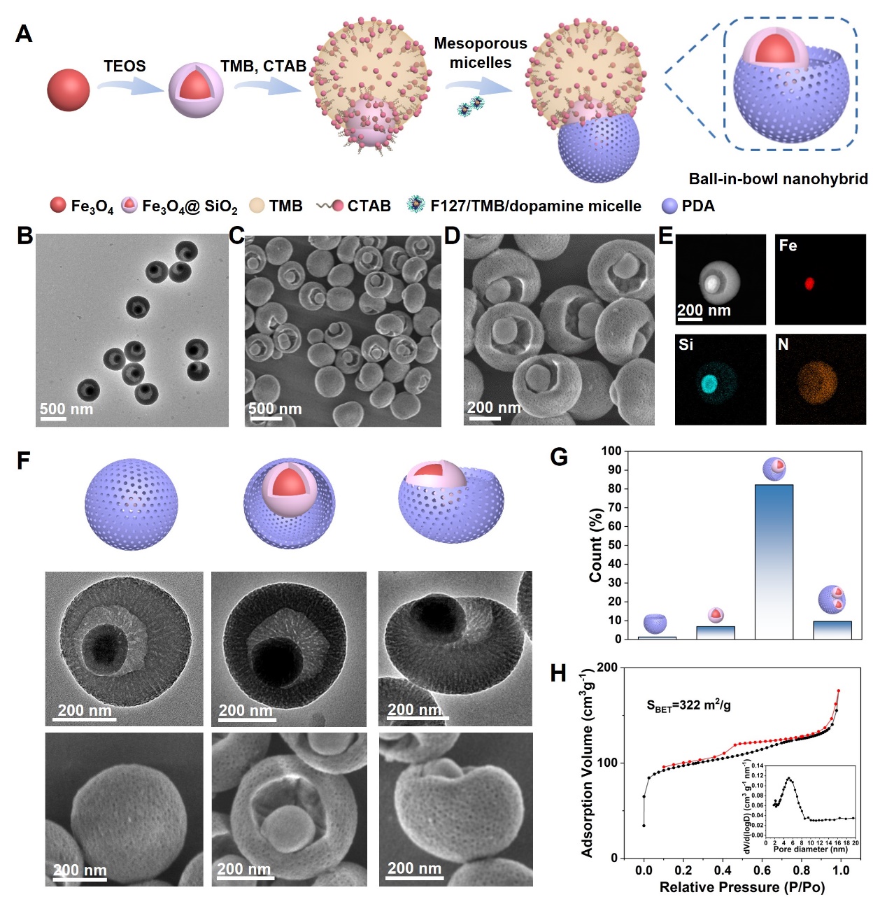 为此,该研究团队提出了一种液-液-固三相界面的各向异性封装策略,利用介孔聚多巴胺(mPDA)对磁性纳米颗粒、镧系纳米颗粒和金纳米棒等进行各向异性封装。通过调节乳液中的表面活性剂,可以精确控制纳米颗粒在水/油界面上的浸润行为,形成核壳、小开口蛋黄壳、碗中球和多瓣等多种形态。以各向异性Fe3O4@SiO2&mPDA介孔纳米复合材料为例,它结合了磁性和光热特性,可作为双推进纳米马达,穿透细菌生物膜并促进伤口愈合,为多功能纳米复合物的设计与应用提供了新的思路。